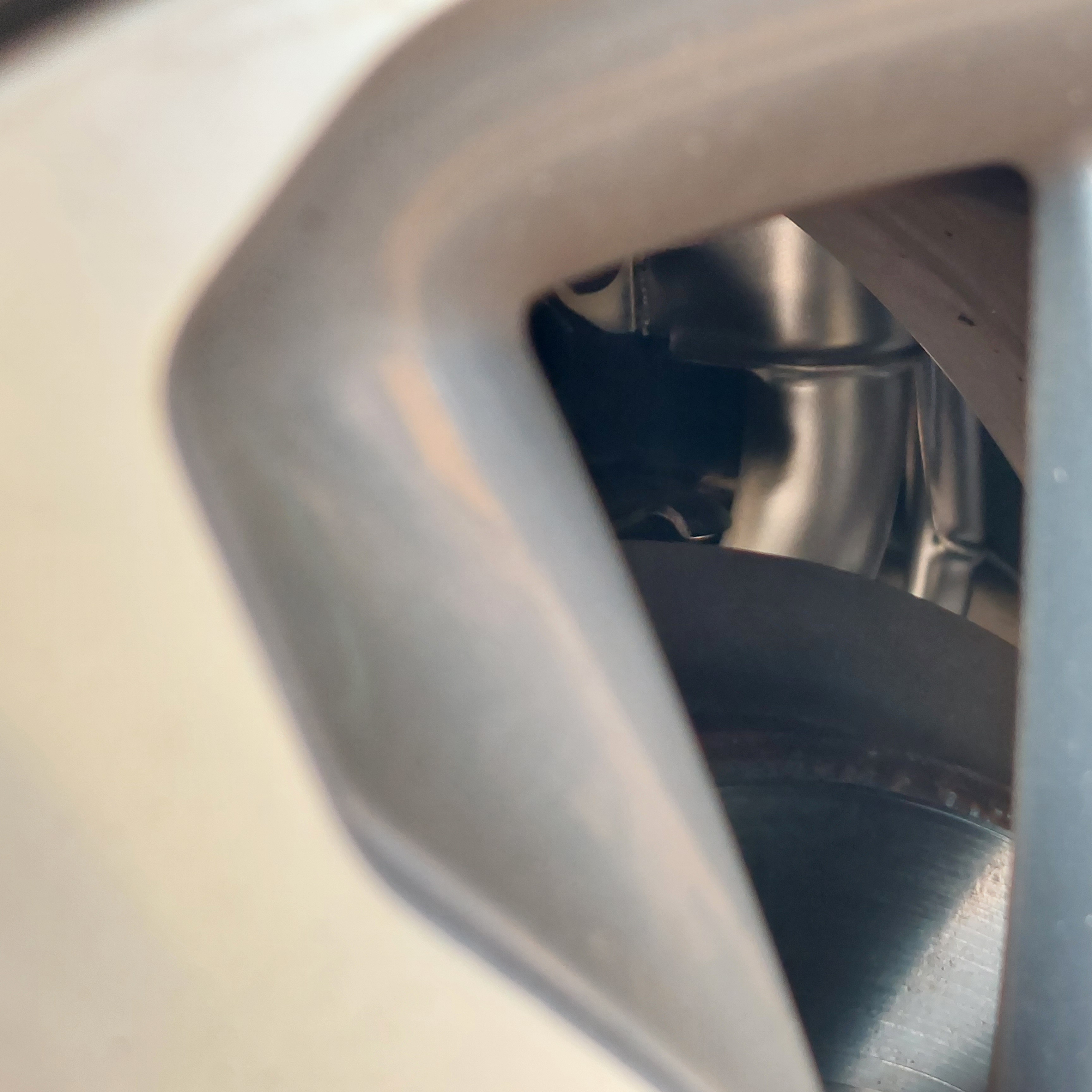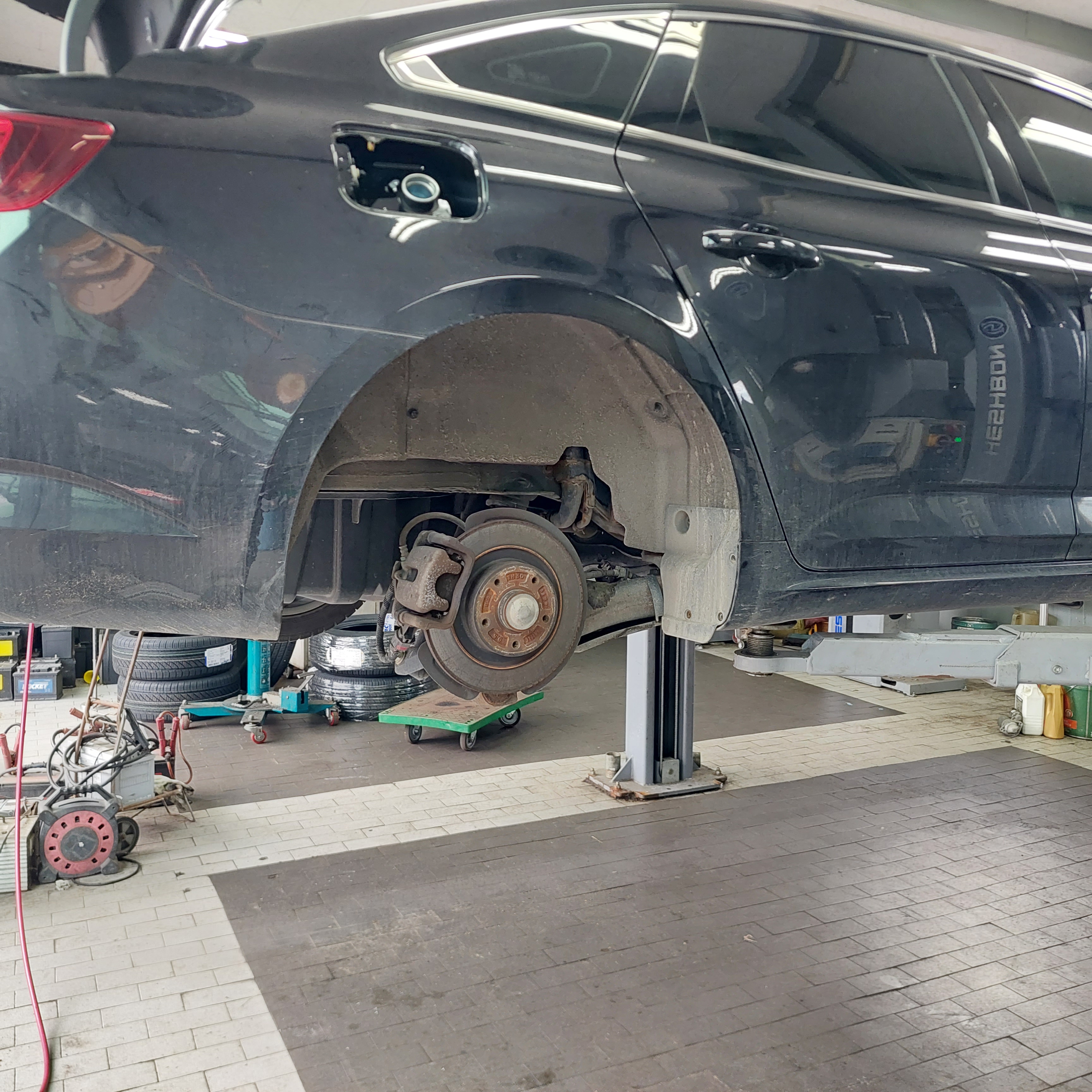 차량 바퀴 휠 안쪽으로 반짝반짝 은색 연료파이프가 보이네요.